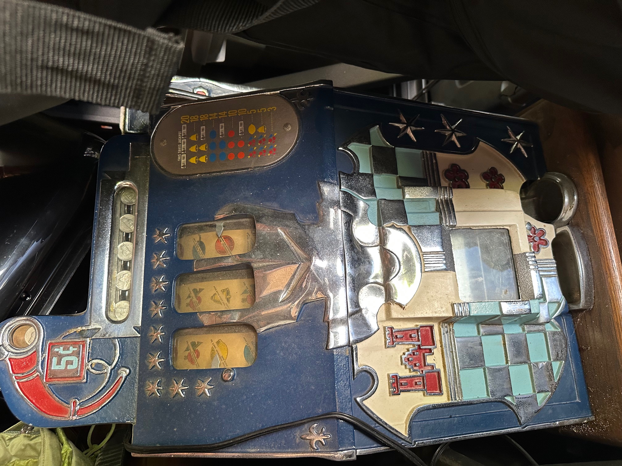 Looking to looking to sell my father’s vintage Mills Castle Front 5-cent slot machine w/ stand(estimated late 1930s–1940s). The machine includes its stand and appears to be largely original.